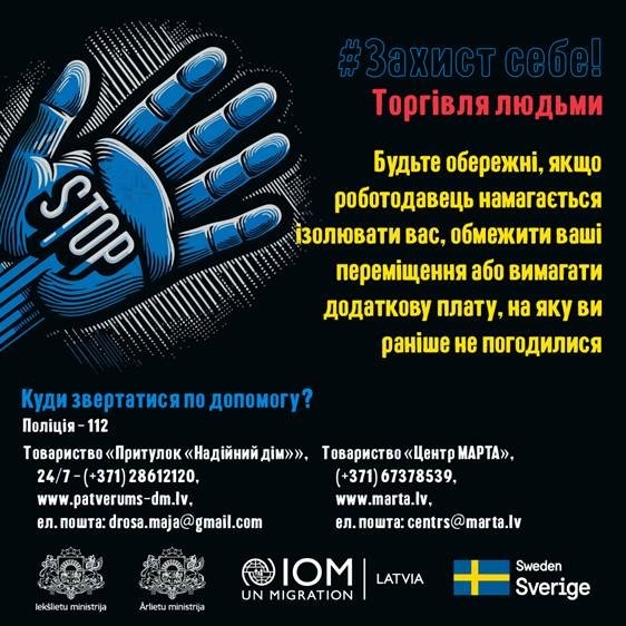 The International Organisation for Migration (IOM) Riga Office in cooperation with the Ministry of the Interior and the Ministry of Foreign Affairs, as well as the digital marketing agency CreateIT, is implementing a digital communication campaign to prevent human trafficking for Ukrainian civilians living in Latvia.
