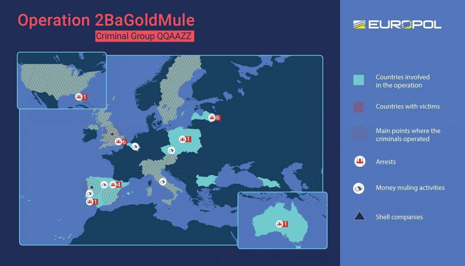 at the beginning of 2019, , the Cybercrime Division of the National Police Office for the Prevention of Economic Crimes (VP ENAP), in cooperation with the US FBI, the Portuguese, Spanish, British, Italian, Bulgarian and Polish law enforcement authorities and the European Union's law enforcement agency Europol, carried out a series of operational measures and investigation activities in the international operation to arrest the organisation of a criminal group involving several Latvian citizens engaged in money laundering. . A joint investigation and strategic planning team was set up in the US, whose members, including the VP'S ENAP Cybercrime Division, planned and detained a member of the organised criminal group during the half-decade. s. On 23 October 2019, a total of 19 persons and 40 searches were carried out in six countries, Latvia, Spain, the United Kingdom, Italy, Bulgaria and Poland. . Another person detained in 2020.