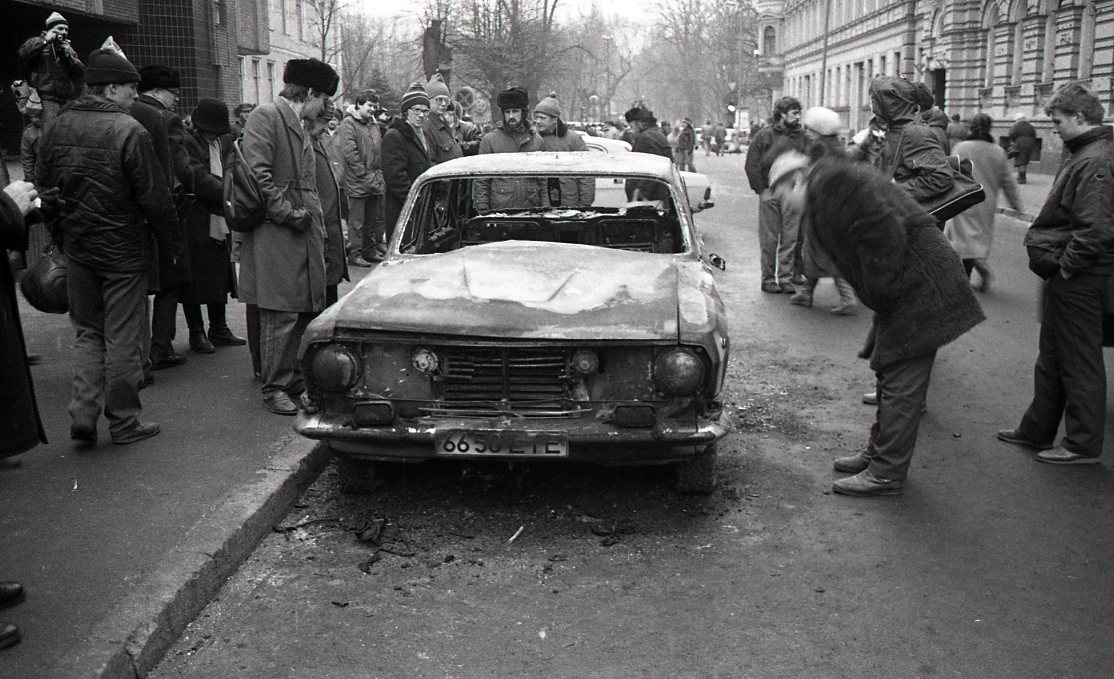Rīga, Reimersa iela, 1991. gads; Apšaudes laikā 20. janvārī aizdegās Latvijas Republikas Augstākās padomes komisijas priekšsēdētāja Alfrēda Čepāņa mašīna; Autors – Jānis Pilskalns; Foto no 1991. gada barikāžu muzeja krājuma