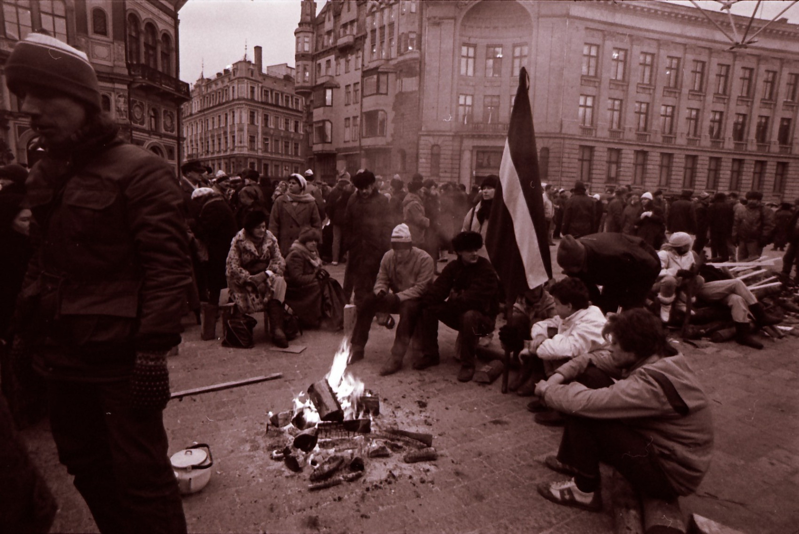 Cilvēki Doma laukumā Redzama Doma baznīca, Rīga, 1991. gada janvāris Autors – Ilgvars Gradovskis Foto no 1991. gada barikāžu muzeja krājuma