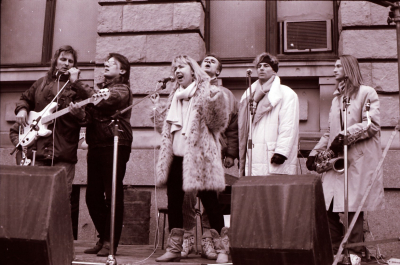 Grupa “Pērkons”, Doma laukumā, Rīga, 1991. gada janvāris; Autors – Ilgvars Gradovskis; Foto no 1991. gada barikāžu muzeja krājuma