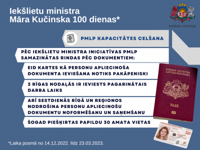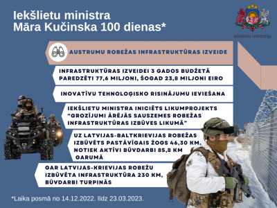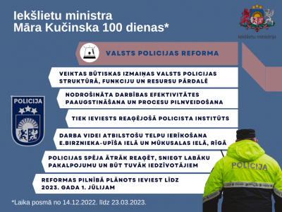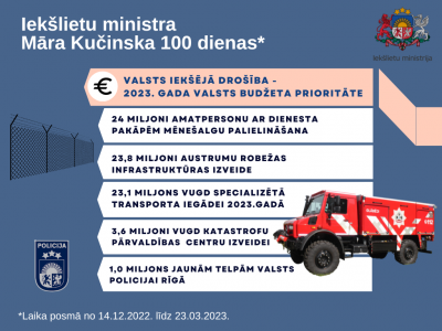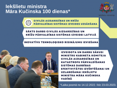 23.martā aprit pirmās 100 dienas, kopš aizvadītā gada 14. decembrī iekšlietu ministra amatā sāka strādāt Māris Kučinskis. Savas darbības pirmajās 100 dienās šajā amatā M.Kučinskis definējis jaunus iekšlietu nozarei nozīmīgus virzienus, kā arī turpinājis un sekmējis darbu ar līdzšinējām iekšlietu nozares būtiskākajām prioritātēm.