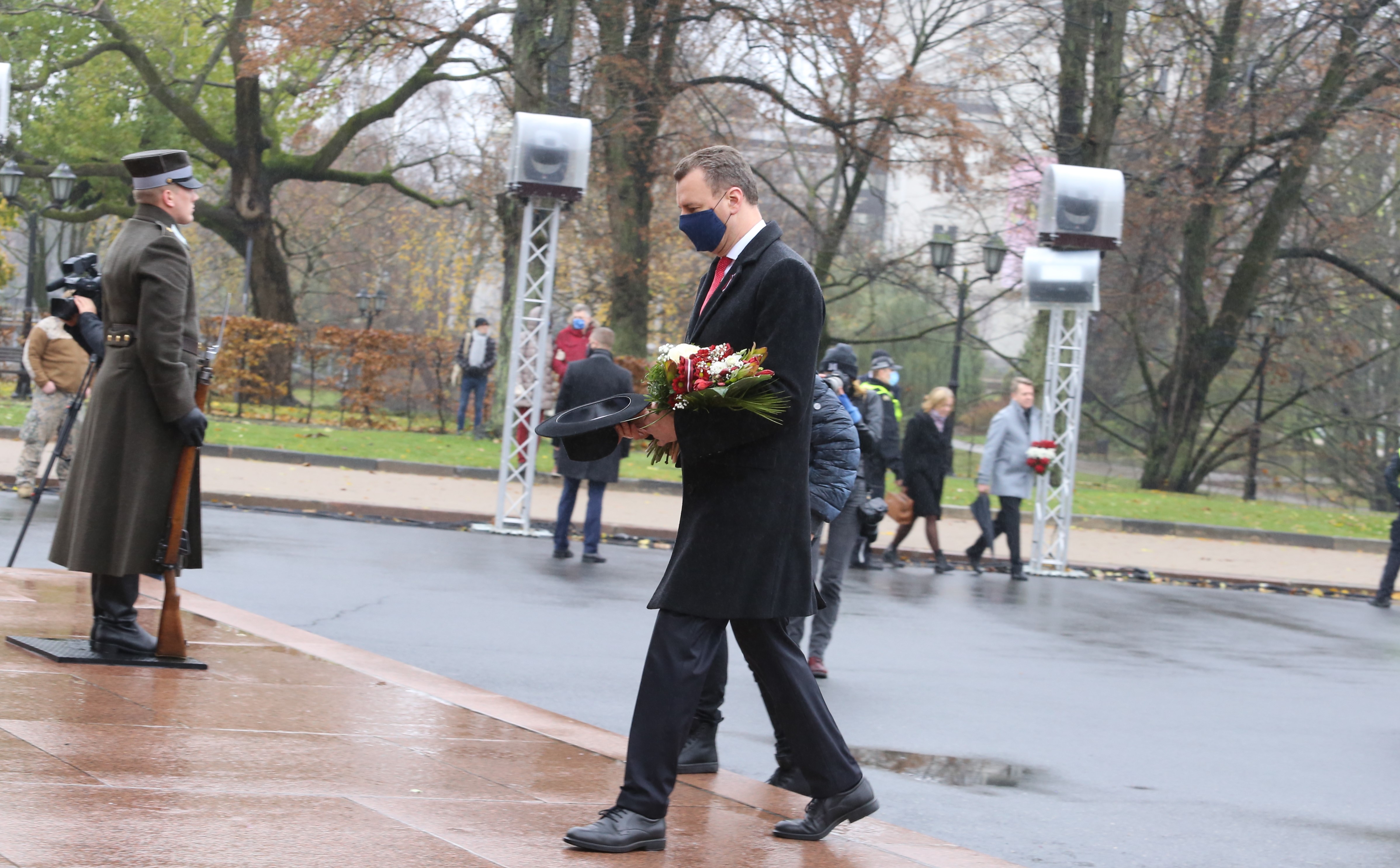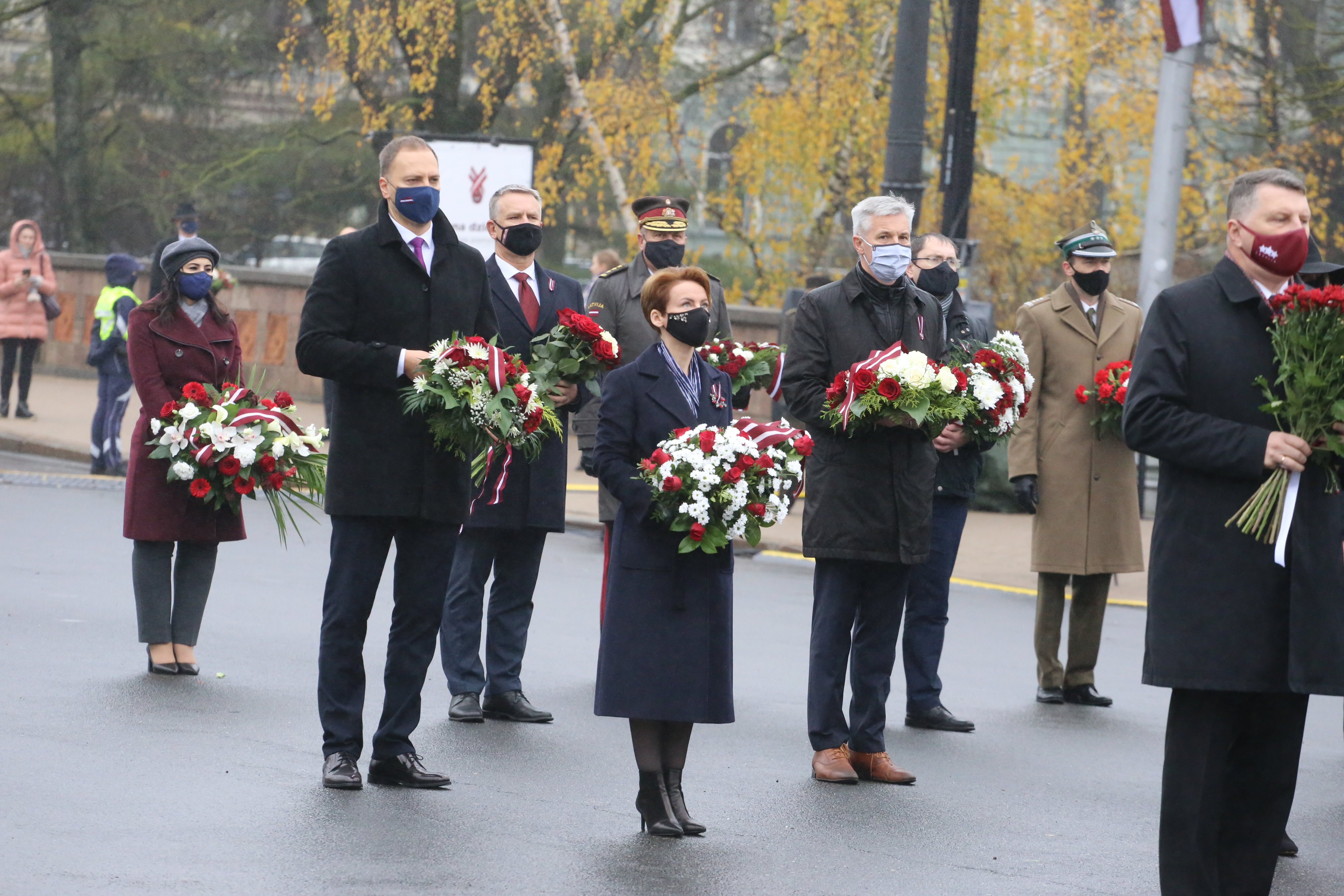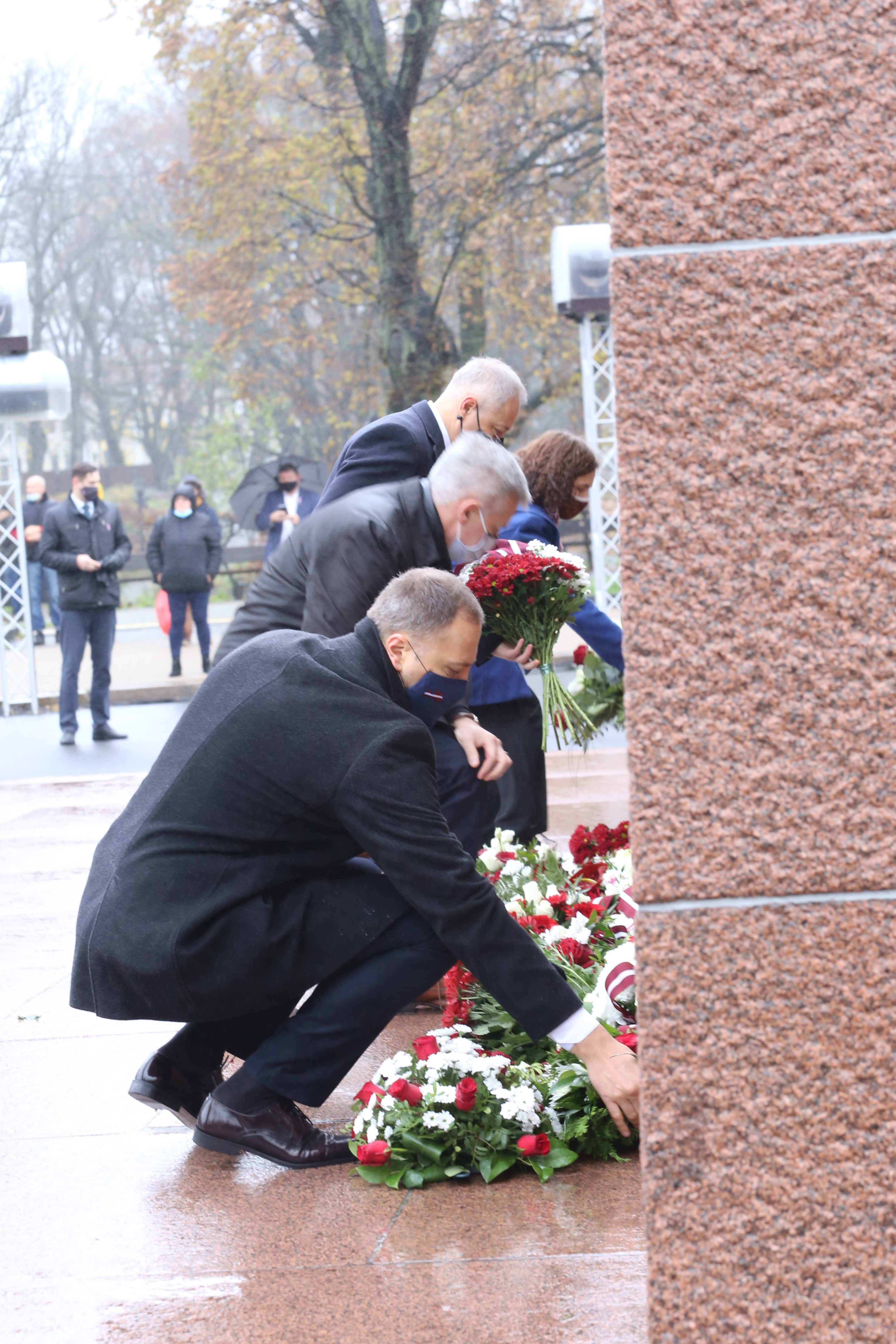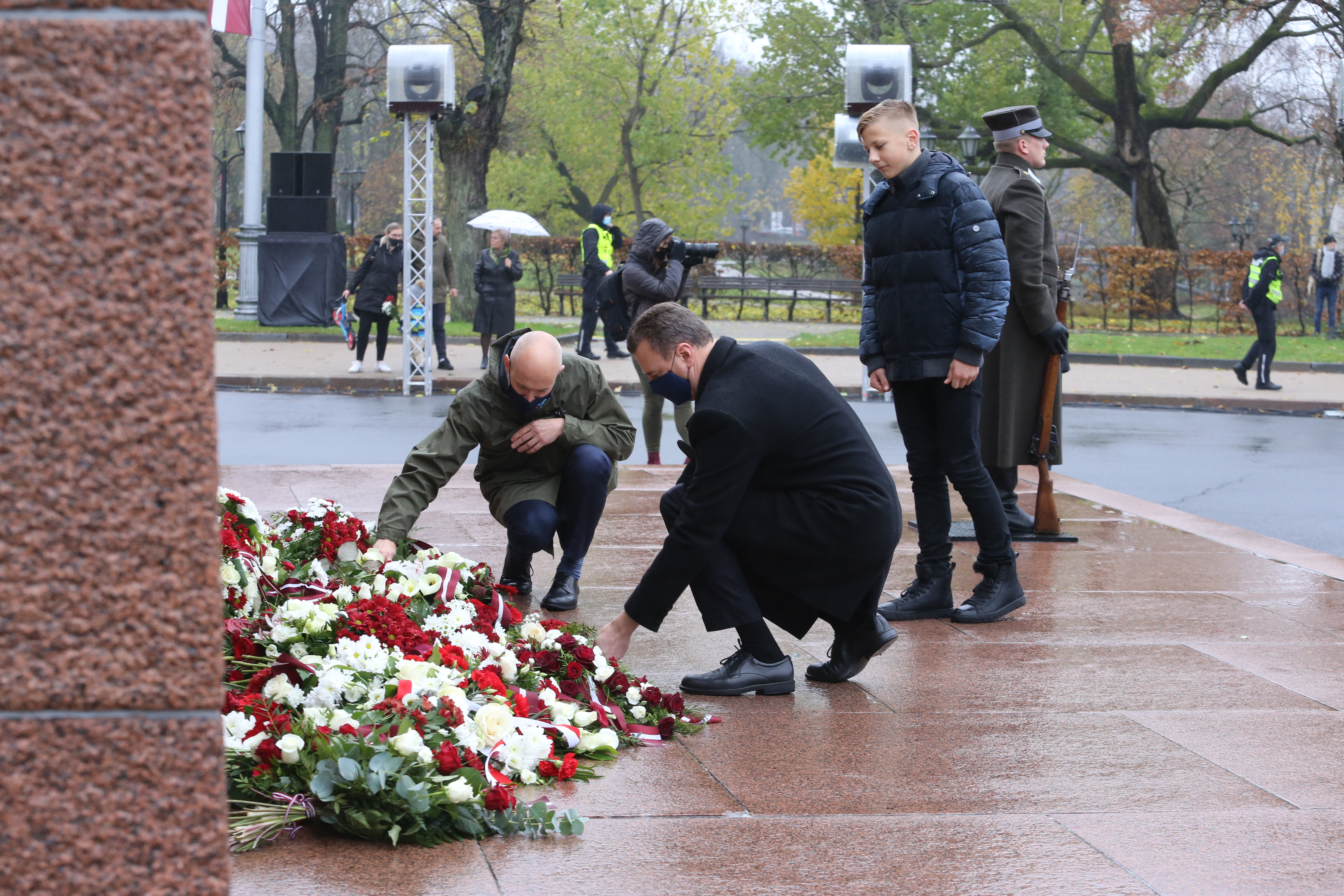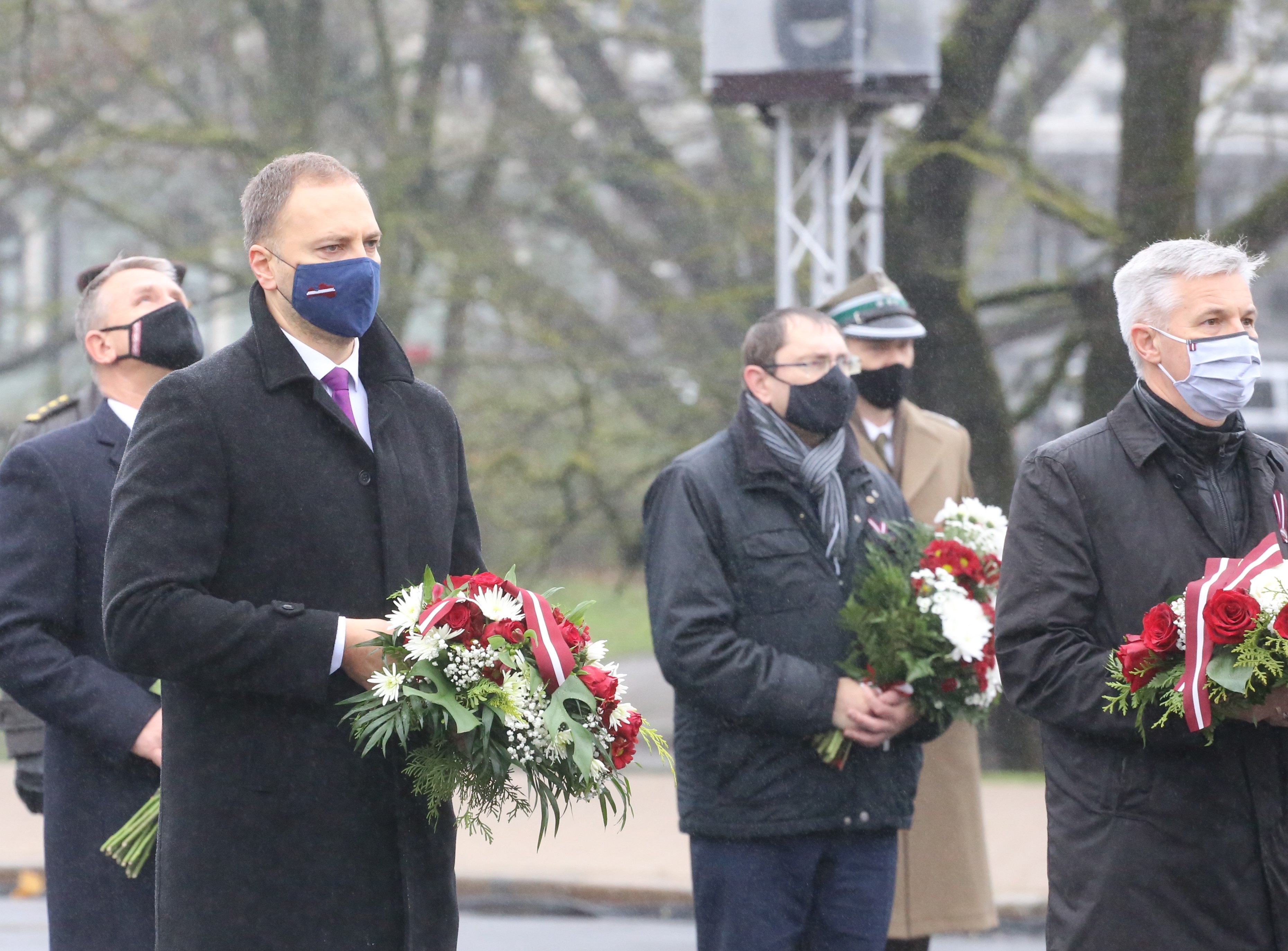 Iekšlietu ministrs Sandis Ģirģens un valsts sekretārs Dimitrijs Trofimovs noliek ziedus pie Brīvības pieminekļa Latvijas Republikas Proklamēšanas dienā