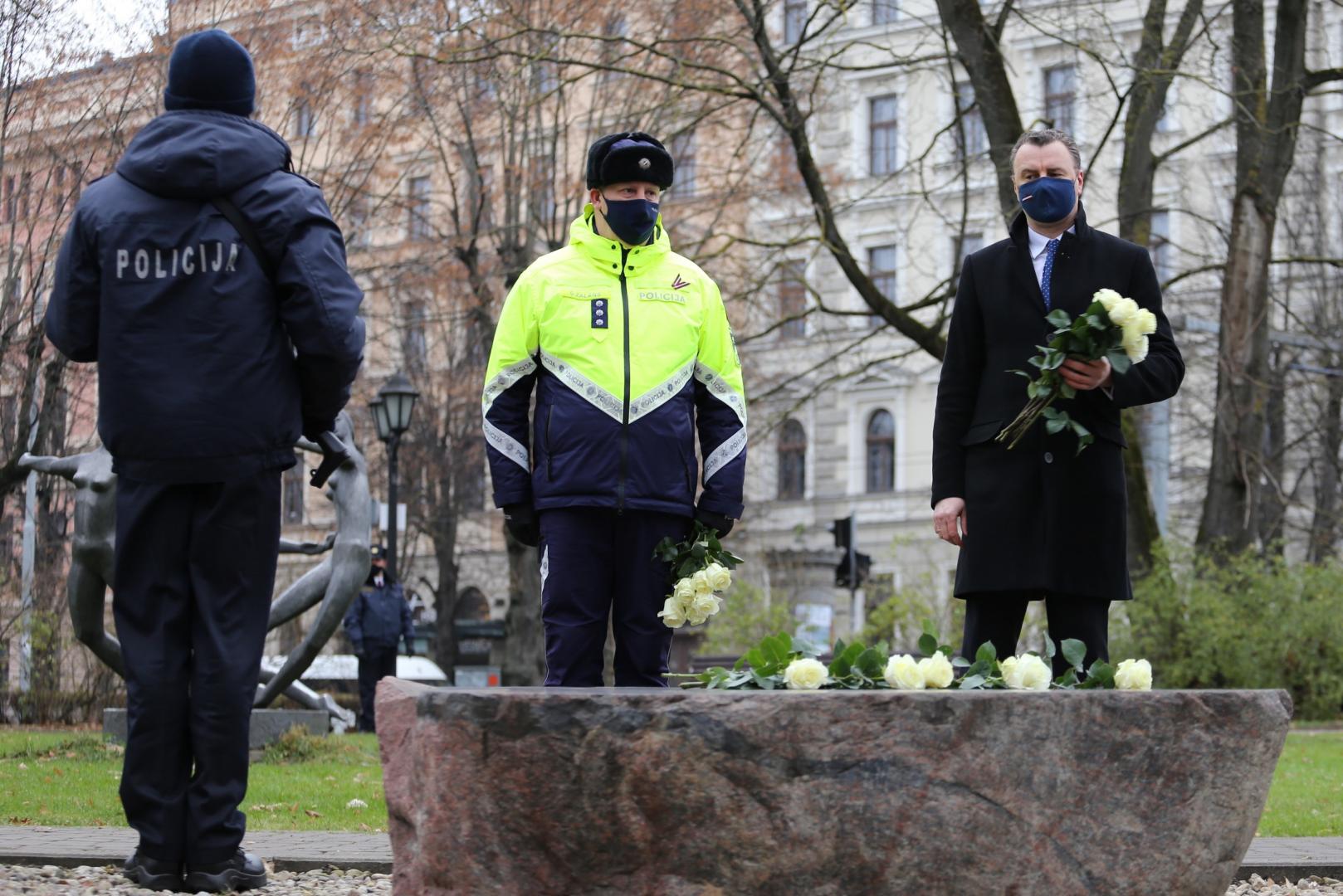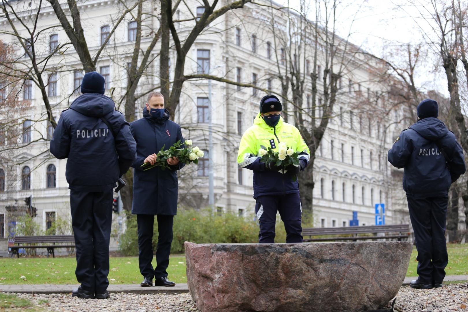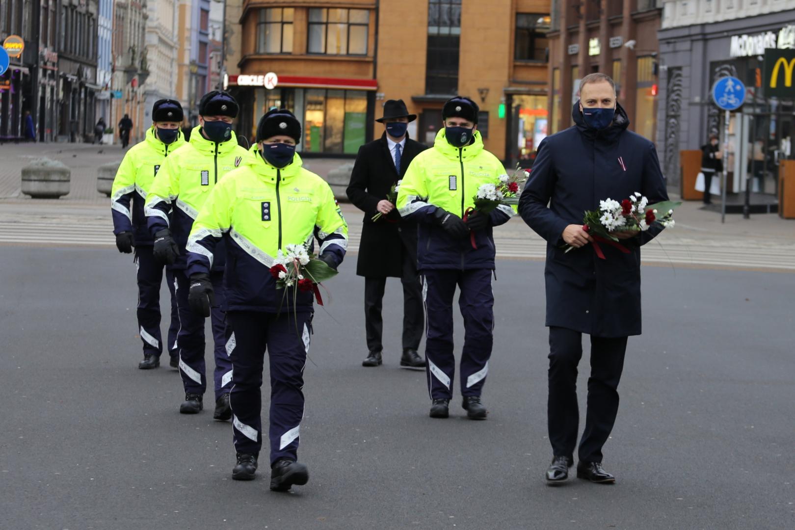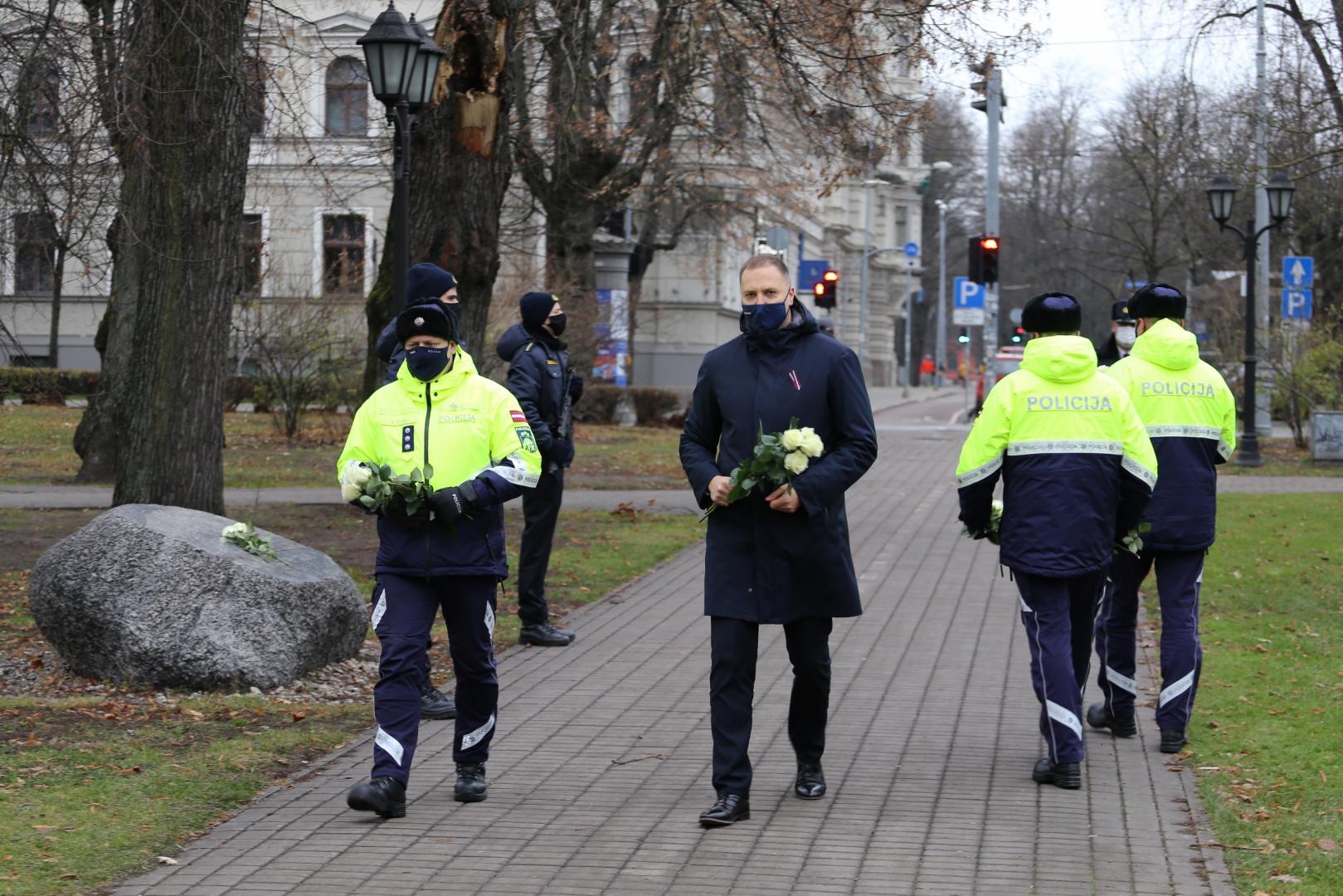 Piektdien, 4.decembrī, iekšlietu ministrs Sandis Ģirģens un Iekšlietu ministrijas valsts sekretārs Dimitrijs Trofimovs kopā ar Valsts policijas priekšnieku Armandu Ruku noliek ziedus pie Brīvības pieminekļa un Bastejkalnā.
