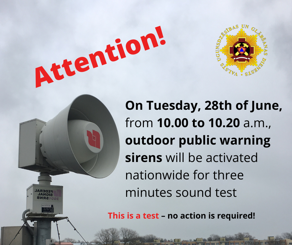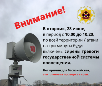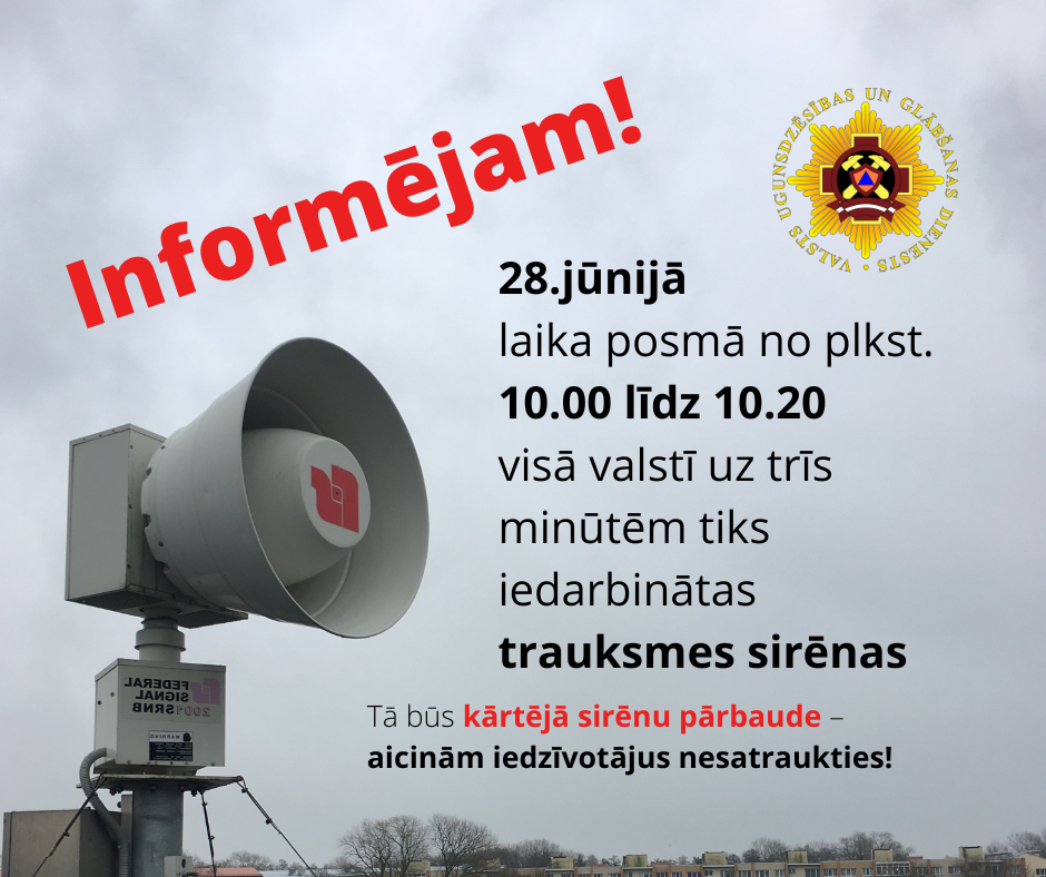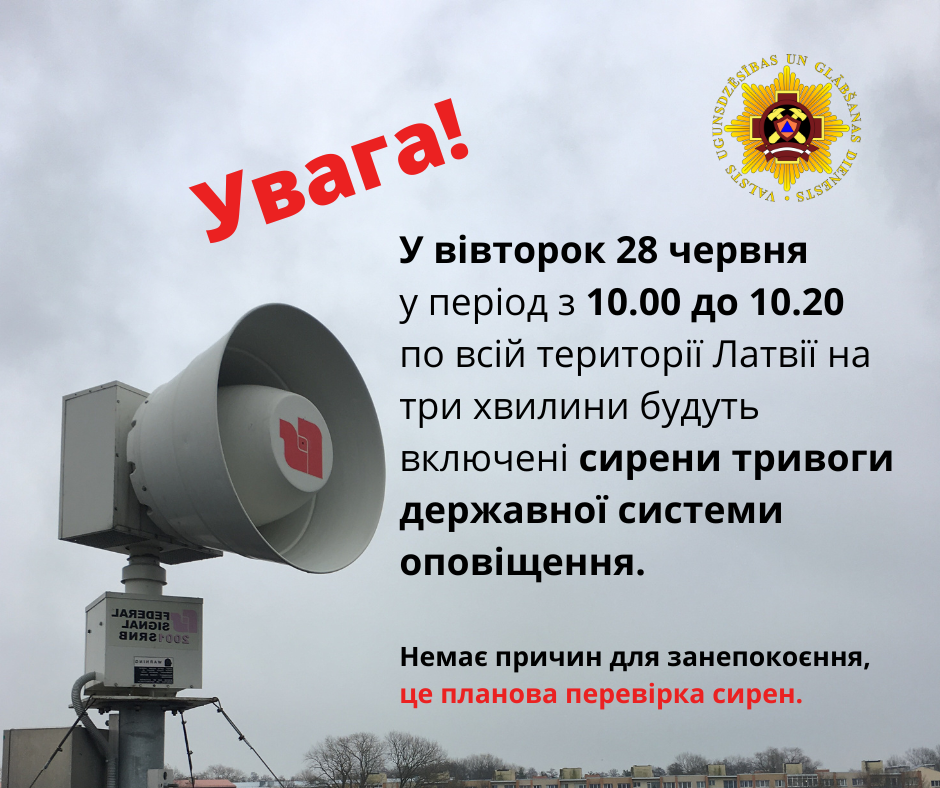 Otrdien, 28.jūnijā, Valsts ugunsdzēsības un glābšanas dienests (VUGD) visā Latvijā veiks trauksmes sirēnu pārbaudi, iedarbinot tās uz trim minūtēm, kā arī pārbaudīs starp VUGD un elektroniskajiem plašsaziņas līdzekļiem (radio, TV) noslēgto līgumu darbības izpildi.