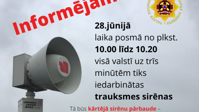 Otrdien, 28.jūnijā, Valsts ugunsdzēsības un glābšanas dienests (VUGD) visā Latvijā veiks trauksmes sirēnu pārbaudi, iedarbinot tās uz trim minūtēm, kā arī pārbaudīs starp VUGD un elektroniskajiem plašsaziņas līdzekļiem (radio, TV) noslēgto līgumu…