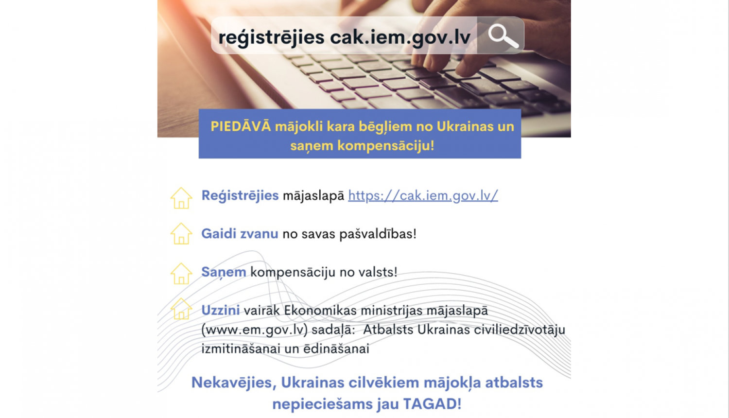 Lai vienkopus apvienotu privātpersonu sniegtās izmitināšanas iespējas ukraiņu bēgļiem, informācijas reģistrā https://cak.iem.gov.lv/ ir izveidota iespēja privātpersonām, autentificējoties ar latvija.lv, reģistrēt savu īpašumu izmitināšanai.
