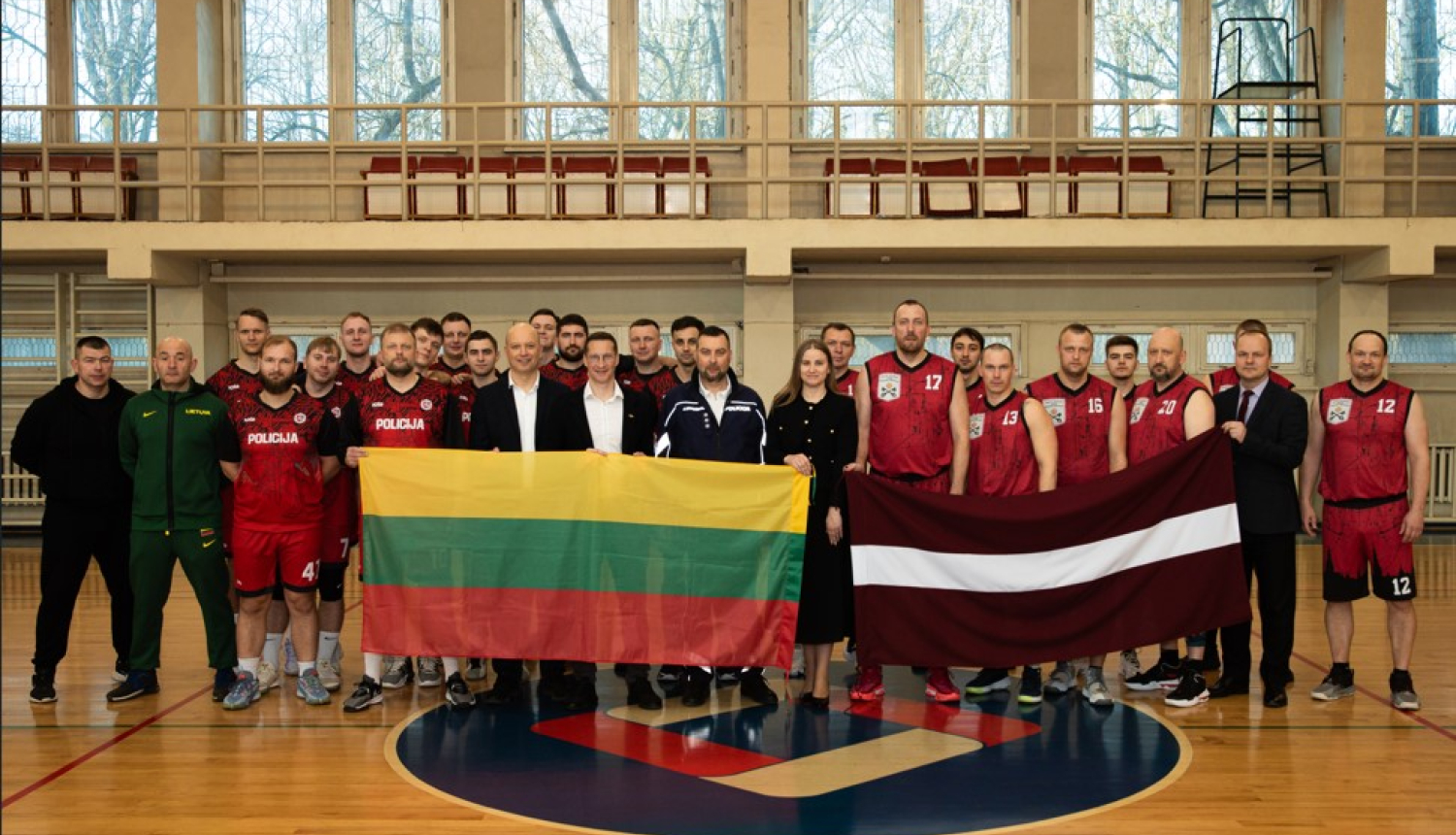 Komandas stāv ar Lietuvas un Latvijas karogu zālē