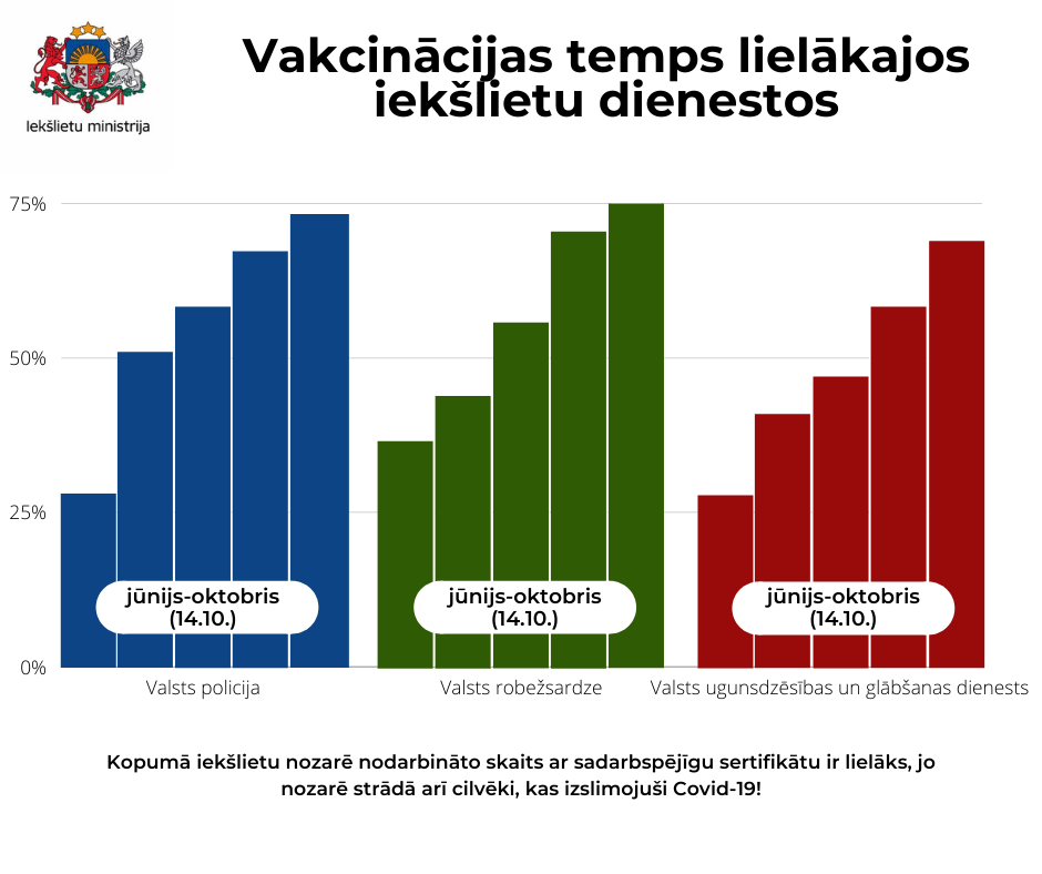 Iekšlietu nozarē vakcinēto nodarbināto personu skaits palielinās katru nedēļu. Uz 14.oktobri kopumā Iekšlietu ministrijā ir vakcinēti 93% no strādājošajiem, Finanšu izlūkošanas dienestā - 99%, Iekšlietu ministrijas poliklīnikā - 94%, Iekšējās drošības birojā - 92%, Iekšlietu ministrijas Veselības un sporta centrā - 90%, Pilsonības un migrācijas lietu pārvaldē - 79%, Valsts robežsardzē - 75%, Valsts policijā - 73%, Nodrošinājuma valsts aģentūrā - 72%, Valsts ugunsdzēsības un glābšanas dienestā - 68% un Iekšlietu ministrijas Informācijas centrā - 60%.