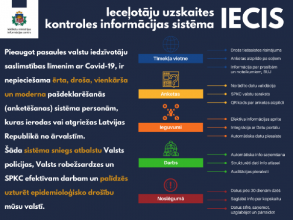 Otrdien, 18. augustā, iekšlietu ministrs Sandis Ģirģens Ministru kabinetam prezentēja Iekšlietu ministrijas informatīvo ziņojumu par informācijas sistēmas “Ieceļotāju uzskaites kontroles informācijas sistēma (IECIS)” izveidi. Šī sistēma tiks veidota, lai digitalizētu jau šobrīd pastāvošo ieceļotāju anketēšanu Covid-19 laikā, un to izstrādās iekšlietu ministrijas Informācijas centrs. Kad tiks ieviesta jaunā sistēma, ieceļotājiem caur specifisku mājaslapu būs jāizpilda anketa ar nepieciešamo personīgo informāciju, kas nepieciešama dienestiem epidemioloģiskās drošības nodrošināšanai. Pēc digitālās anketas aizpildīšanas katrai personai tiks izveidots un piešķirts personalizēts QR kods. Sistēma sniegs atbalstu ikdienas darbā un atvieglos sadarbību starp atbildīgajiem dienestiem - Valsts policiju, Valsts robežsardzi un Slimību profilakses un kontroles centru.