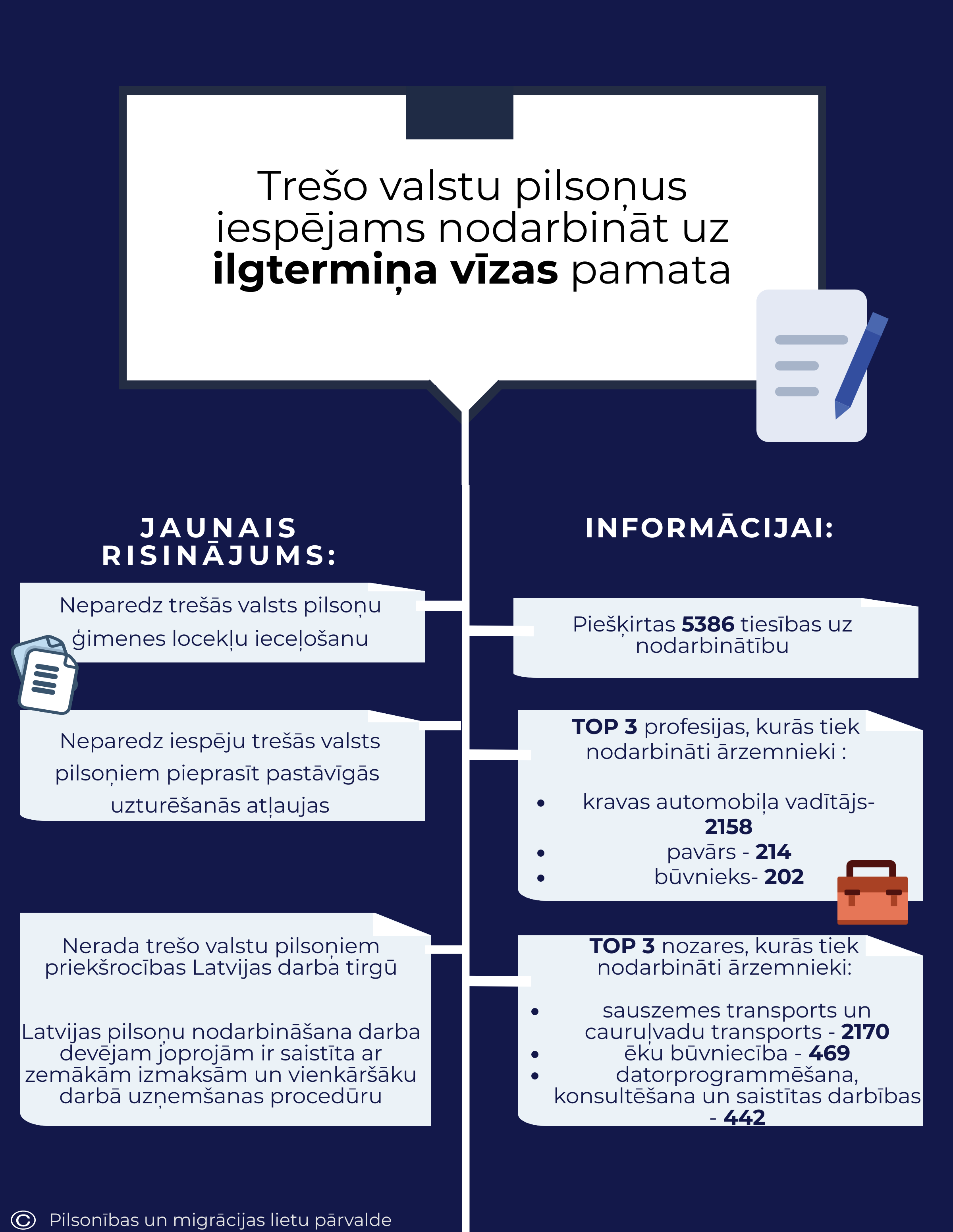 No 2019. gada 1. jūlija stājas spēkā grozījumi Imigrācijas likumā, kas paredz iespēju darba devējiem nodarbināt trešo valstu pilsoņus uz ilgtermiņa vīzas pamata. Lai uzaicinātu darbā trešās valsts pilsoni, darba devējam jāreģistrē brīva darba vieta Nodarbinātības valsts aģentūrā un jebkurā Pilsonības un migrācijas lietu pārvaldes klientu apkalpošanas centrā jānoformē ielūgums.