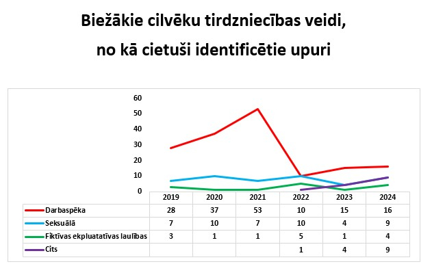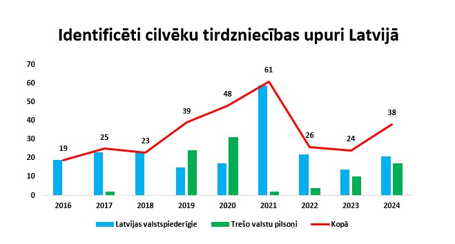 Kopējais identificēto cilvēku tirdzniecības upuru skaits Latvijā no 2016. līdz 2024. gadam ir 303 upuri – gan Latvijas valstspiederīgie, gan trešo valstu pilsoņi.