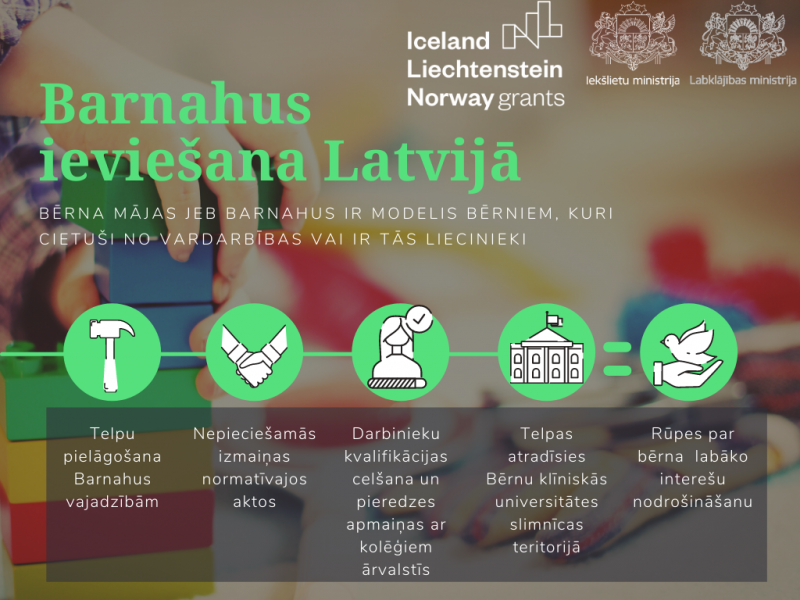Bērnu māja (Barnahus) ir pasaulē atzīts starpinstitucionālās sadarbības modelis, kurā īpašs uzsvars likts uz cietušā bērna interesēm un maksimāli saudzējošu pieeju gadījumā, ja nepieciešama tiesību aizsardzības institūciju iejaukšanās. Projekts jāievieš līdz 2024. gada marta beigām. Tā kopīgais finansējums Eiropas Ekonomiskās zonas programmā “Starptautiskā policijas sadarbība un noziedzības apkarošana” ir 2,07 miljoni eiro.