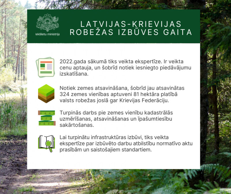 Līdz 2022. gada 1. janvārim atsavinātas un zemesgrāmatā uz valsts vārda Iekšlietu ministrijas personā nostiprinātas īpašuma 324 zemes vienībām aptuveni 81 hektāra platībā valsts robežas joslā gar Krievijas Federāciju. Turpinās darbs pie zemes vienību kadastrālās uzmērīšanas, atsavināšanas un īpašumtiesību sakārtošanas.