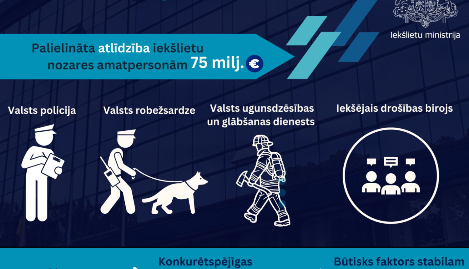 Šodien, 18. decembrī,  Ministru kabinets (MK) apstiprināja grozījumus MK 2016. gada 13. decembra noteikumos Nr. 806, lai ar 2025. gada 1. janvāri nodrošinātu iespēju paaugstināt atlīdzību iekšlietu nozares iestāžu (Valsts policijas, Valsts robežsardzes, Valsts ugunsdzēsības un glābšanas dienesta, Iekšējās drošības biroja) un Tieslietu ministrijas Ieslodzījuma vietu pārvaldes amatpersonām ar speciālajām dienesta pakāpēm. Grozījumi paredz noteikt amatpersonām jaunu piemaksu par noteiktu funkciju un uzdevumu izpildi 300 eiro (bruto) apmērā un pārskatīt un palielināt amatpersonu esošās mēnešalgas.
