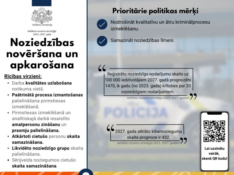 Viena no ministrijas politikas jomām, kuras ietvaros ministrijas padotībā esošas tiesībsargājošās institūcijas, reaģējot uz noziedzīgām izpausmēm, piemērojot praksē izstrādātas metodes noziedzības apkarošanai un sekojot aktuālākajām pārmaiņām noziedzīgo darbību izpausmju attīstībā, nodrošina sabiedrības drošību un sabiedriskās kārtības ievērošanu.