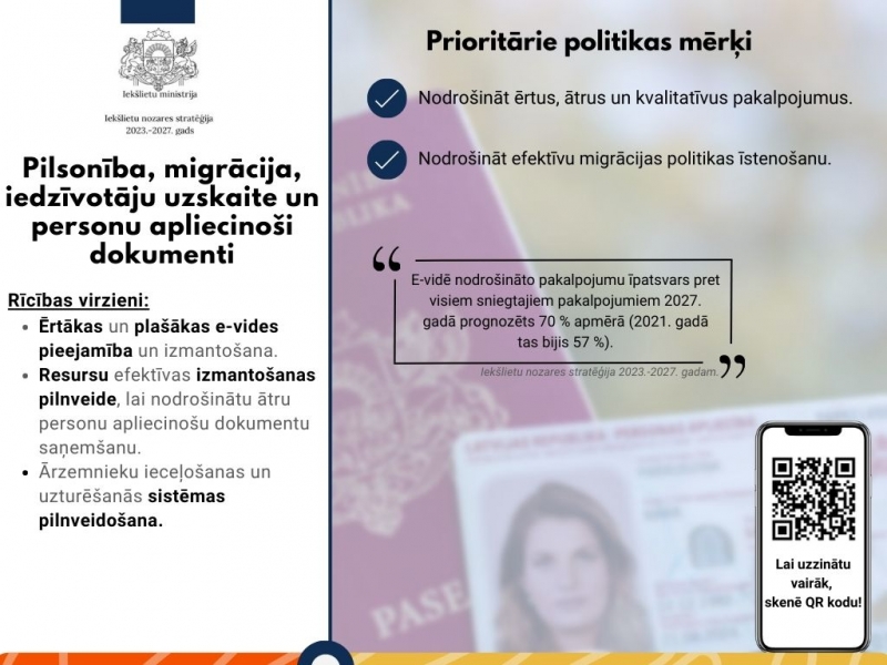 Savukārt migrācijas politikas jomas ietvaros tiek veikta ārzemnieku, tai skaitā citu Eiropas Savienības pilsoņu ieceļošanas, izceļošanas un uzturēšanās valstī kontrole, lai nodrošinātu starptautiskajām tiesību normām un Latvijas valsts interesēm atbilstošu politikas īstenošanu.